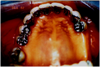 Figure 2: The first step of the prosthodontics was the palatinal arch splinting, via adhesive partial crown construction which improved articulation gradually.