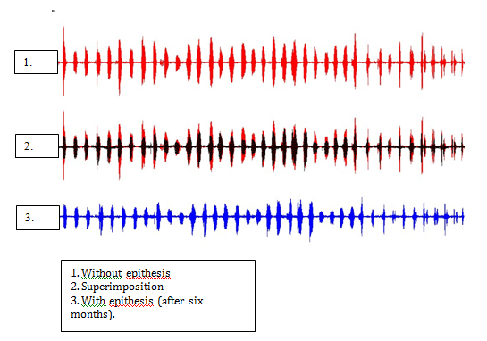 Table 5: The "voice on set durations" of consonant plus open vowel sound data obtained from the patient before and after epithesis insertion showed improvement during six moths (byte).