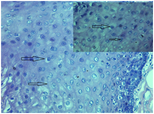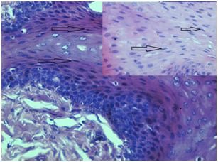 Generalized cytoplasmic vacuolation along the basal and supra basal layers were evident. It was also observed that spinous cells showed edematous changes. Cytoplasmic membrane and nuclear membrane were discernible.