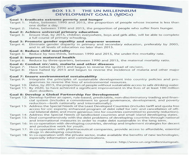 The agenda made claims that it was placing “stronger emphasis than ever on the developing country itself as the starting point for development corporation efforts”.18 The aforesaid goals re-affirmed even if rhetorically the somewhat centrality of poverty reduction in ODA programming and they were incorporated into We the peoples: the Role of the United Nations in the 21st Century.19 This was subsequently followed by the millennium development goals that modified the OECD’s proposal by adding a specific goal to combat HIV/AIDs, malaria and other diseases and by dropping20 the referral to reproductive health services.