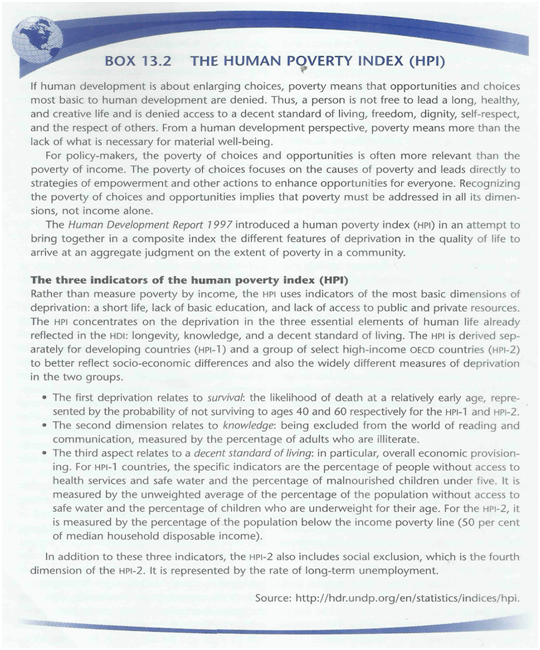 In the case of extreme poverty, other non-income data have engaged to bring out the dept and persistence of extreme poverty. White further argues that deprivation in any sphere and others are hard to quantify–environmental quality, spiritual and political freedom–can equally be referred to as poverty.31 Drawing down further the description of poverty, Kanbur et al.,32 highlight a progressive expansion from the focus on command over market–purchased goods (income) to other dimensions such as longevity, literacy and healthiness and most recently to concerns with risk, vulnerability, powerlessness and lack of voice. Stewart, Saith, and Harriss–White, push that the most prominent are: income/consumption (the basis of the dollar-a-day benchmark), capabilities, social exclusion and participatory assessment.33 The human rights perspective is most and better addressed when the Human Poverty Index (HPI) is sourced.34 In this wise, if human development circles, around expanding choices, poverty then means that opportunities and choices, most basic to human development are denied. A poor person is not at liberty to lead a long, healthy and creative life as he is denied access to a decent standard of living, freedom dignity, self-respect and the respect of others. The consequence of poverty is legion. A poor person suffers exclusion that is primarily discriminatory. The affliction of poverty compounds e.g. the poverty of choices and opportunities is often more excruciating than the poverty of income.