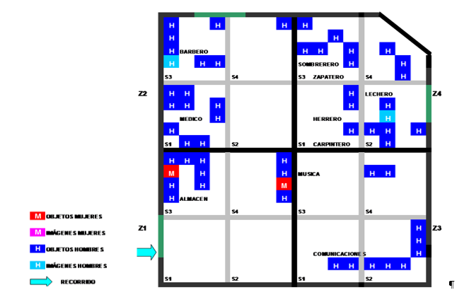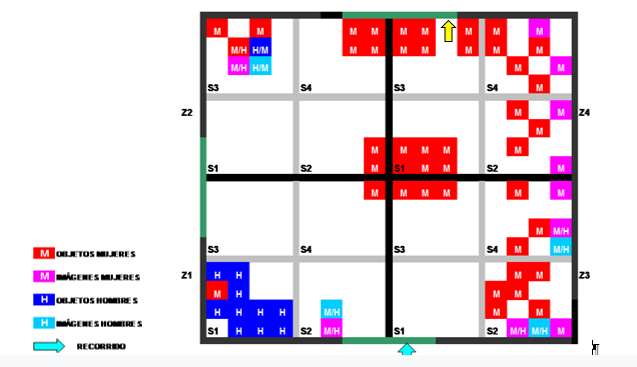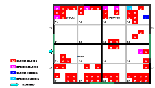 In the museum rooms we propose a gridded scheme with squares. Regarding the museum The Faces of the Pampa of Villa Lía, San Antonio de Areco, in the Women of the Landowners, Rich room, it is assumed that the room is dedicated to them; However, in some sectors there are male elements. In relation to the trades room, it would seem that, at the beginning of the 20th century, all trades had been male, with some exceptions. In the Immigrant Woman (poor) room, there is an overwhelming presence of feminine objects and symbols.