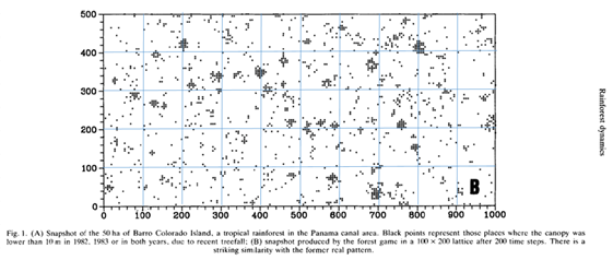 Two ecologists,9,10 developed a very simple model about what happens in forests and the way in which they self-organize. Although the model is simple, it accounts for the most important biological processes produced in the system investigated. Both studied the forests of Barro Colorado Island in Panama. They found a potential relationship between the frequency of gaps of different sizes and the size of those gaps. Furthermore, they developed an equation that is summarized in