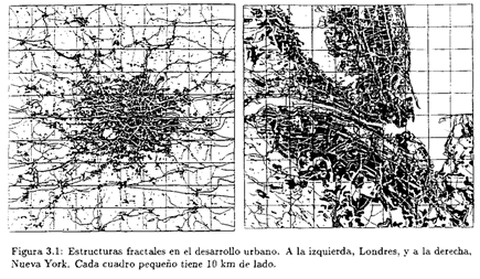 Figure 7 Fractal structures in two cities. In Order and chaos in complex systems. Applications, by Solé and Manrrubia 1993: 78.