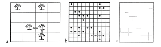 Manrubia9 proposed a model called “forest game” which consists of imagining the forest as a super board similar to that of a chess, but with many more squares (there can be thousands). It is considered that in each empty square a tree sapling can appear with a certain probability. When a tree occupies a square, it does so following a simple rule: an amount is added to its mass, but that amount depends on what is in the eight neighboring squares. Thus, the larger the trees in those squares are, the less the tree in the central square will grow. On the other hand, each tree can die according to a draw that is done periodically. When it grows to a predetermined size, the tree inevitably dies. When each tree dies – the one that when it falls can knock over the neighbors – it leaves a clearing. Consequently, the size of that clearing is represented by the number of squares it affects, and is proportional to the size of the tree when it dies. According to time segments, what will happen in the next step is calculated for each square and the forest plan is updated with all that information. In this exercise there is no force outside the forest itself (storms, winds, fires, predators), there are only the trees growing and competing with each other and the effect of that competition manifests itself in less growth (Momo 2019). And here chance is located with respect to two processes, the probability of death before the maximum size of the tree is reached and the probability that the sapling repopulates an empty square. This compartmentalization in the form of a board allows the “box-counting” method to be applied11 (Figure 6–8).