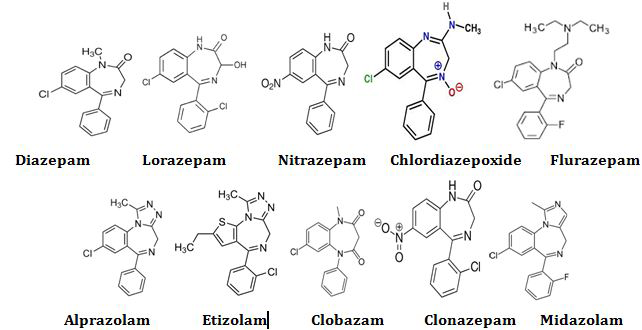 Drug-facilitated crime (DFC)4 is a general term that includes rape or other sexual assault, robbery, money extortion, as well as the deliberate maltreatment of the elderly or children under the influence of psychotropic substances. DFC are criminal acts carried out by means of administering a substance to a person with the intention of impairing behaviour, perceptions or decision-making capacity. It also extends to taking advantage of an impaired person, without their consent, after their voluntary intake of an incapacitating substance. While the covert use of drugs to facilitate crime has occurred over the centuries, it has been recently been highlighted by a significant increase in reports of DFC worldwide. The DFSA,5 which is a subset of DFC, occurs when a person (male or female) is subjected to sexual act(s) while they are incapacitated or unconscious due to the effect(s) of ethanol, a drug and/or other intoxicating substance, and as a result unable to resist or consent to such acts. Substances may be administered covertly to an intended victim or victims, or a perpetrator may take advantage of a victim after voluntary ingestion of the substance. The use of the term “date rape” by the media in cases of sexual assault, to describe DFSA, may be misleading. The media has focused on only a few of the drugs such as Rohypnol®, GHB and ketamine that can be used in DFSA.5 However, there are many other substances that can be used to facilitate such crimes including alcohol, over-the-counter medicines, other psychoactive prescription drugs and illicit substances. The abuse or misuse of BZDs is internationally widespread which means that any forensic laboratory may encounter a range of these compounds. In general, BZDs encountered in the illicit market are diverted from legitimated sources. The BZDs are currently by the far most important and most widely used anxiolytic drugs and some compounds are as sedato-hypnotics, anticonvulsants, muscle relaxants or anesthetics. The BZDs can also amplify the depressant effects of other drugs, including alcohol and opiates, so increasing the risk of overdose in polysubstance use. In this study, we have chosen ten of the BZDs viz. Diazepam, lorazepam, nitrozepam, chlordiazepoxide, flurazepam, alprazolam, etizolam, clobazam, clonazepam, and midazolam drugs, each having different structural characteristics (Figure 1).