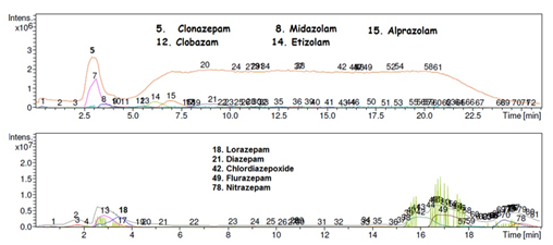 Recommendations: The results of the study showed that the proposed LC-MS/MS method is simple, rapid, precise and accurate, which is useful for the separation and identification of BZD drugs in forensic, clinical analytic toxicology and might be useful for the analyses of suspected drug-facilitated sexual assault (DFSA) cases.