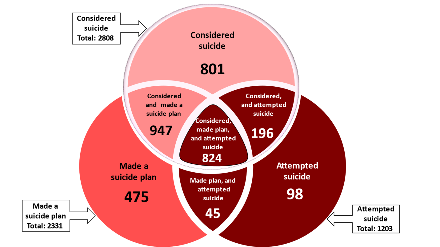 As it is seen on the vein diagram, among the responders 2808 participants reported that they considered suicide 2331 of them made a suicide plan and 1203 participants stated they attempted suicide. The figure also present individuals who selected multiple answers regarding the suicide behaviors. The following table presents responders who considered attempting suicide. As it is seen in Table 2, 28.5 % (801) of the participants reported that they only considered suicide, 33.7% (947) of them stated they both considered and made a plan, 7% (196) of them considered and attempted suicide, and 30.8% (864) of them considered, made a plan, and attempted suicide. This group and their responses for other indicators were included to the study. However, the other group -participants who did not select the consideration question- should be examined and highlighted here.