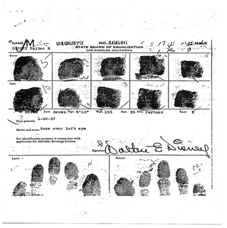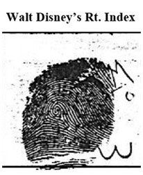 The tremendous talent and imagination of Walt Disney was a valuable gift for all mankind. He was indeed above and beyond the average thinker. And he did however possess a very rare fingerprint pattern. Walt Disney displayed a Central Pocket Loop Type Whorl pattern with a meeting tracing on his right forefinger. Under the NCIC FPC it is classified as CM. In 1993 the FBI conducted a study on the frequency of fingerprint patterns which included 17,951,192 males. Among those studied only 32,999 displayed the classification of CM on the right forefinger. This study would place Disney’s frequency for this classification of the pattern to be 0.18% (Figures 1 & 2).