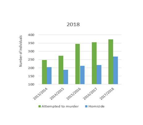 Figure 5 Comparative analysis from 2013-2018 on number of incidents where an attempted murder or murder has taken place, data achieved by recreating statistics from (30).