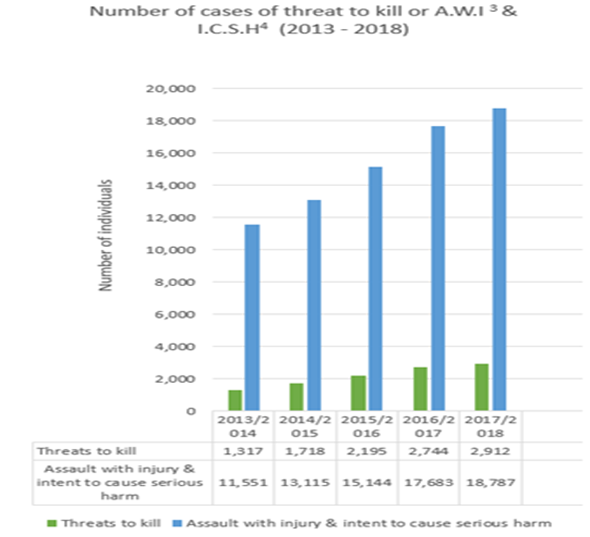 Figure 6 Comparative analysis from 2013-2018 on number of incidents where assault with injury & intent to cause harm or threat to kill has been made, data achieved by recreating statistics from (30) (see graph12,13).