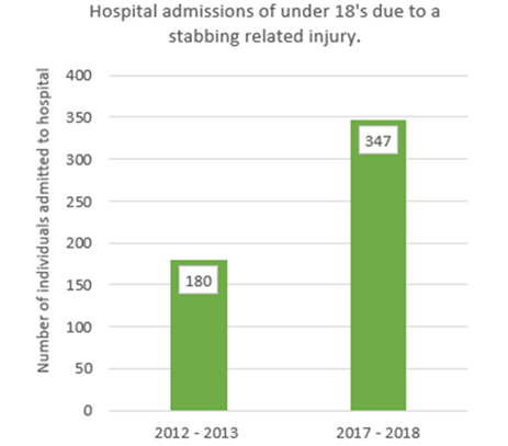 Figure 7 Number of hospital admissions comparison of under 18’s due to a stabbing related injury, data sourced from (32).
