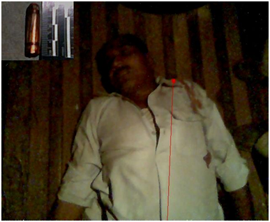 The deceased was hit by the bullet on the top of his left shoulder and there were holes found in his baniyan and kurta at that place. There was no burning, blacking and tattooing around the wound and on the clothes. This eliminates the possibility of firing from close range. Autopsy revealed that the bullet traveled almost straight from upper to lower part of the body without any exit wound but the area surrounding the spot was almost plane, without any tall tree and high-rise structure (Figure 2). It seems quite impossible that a gun fired from such a plane place could results in an injury like this in normal circumstances. Secondly the deceased’s friend Chakrapal who was present during the incidence also told that he could not hear any sound of gunfire at the time of incidence. It means the bullet was fired from a distance too far for the shot to be heard. It is a well known fact that a rifle bullet fired upward in air at a non vertical angle follows a parabola path and covers a long distance. Further a soft nose bullet of 8mm caliber having six right handed land and grooves was recovered from the body during postmortem. The caliber and number of land and grooves present on the bullet shows that it was fired by some standard .315 caliber company made rifle. This rifle produce quite prominent sound when fired i.e. the sound of its fire can’t be unnoticed. Further bullet fired from such a rifle can cover a very long distance. On the basis of above findings it can be concluded that the bullet was fired by someone in air with standard .315 caliber company made rifle and on its return journey it hit the upper side of the man’s shoulder.