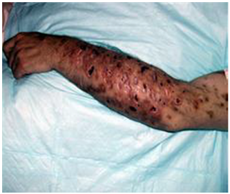 Figure 4 An example of a severe case of skin popping as a result of veins collapsing due to repeated injection of heroin.22