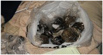An escalation in border security theoretically may drive up the price of heroin in the U.S. potentially dissuading users due to prohibitive costs. However, this may result in a shift in the dynamics of the problem onto another drug rather than stop the user from abusing completely. Cities are reporting an increase in heroin overdose deaths and that they are more commonly found in suburban areas and outlying counties surrounding the cities.63 Possible reasons for the increases in overdose deaths include an overall increase in heroin users and increased Mexican Purity levels in batches of heroin causing abusers to accidentally overdose.63 Heroin of higher purity can be snorted or smoked which broadens its appeal. Many people who would never consider injecting a drug were introduced to heroin by inhalation.63 The most common type of heroin produced in Mexico is ‘black tar heroin’. An image of what this looks like before preparation for administration is shown below in Figure 13.64