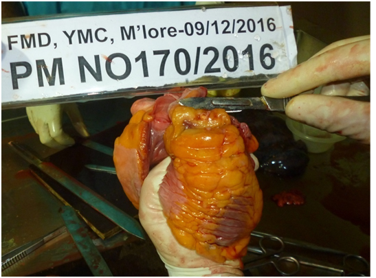 The dead body of a female, medium built and well nourished was received for autopsy. External examination showed generalized vitiligo present on the body (Figure 4). Multiple hyperaemic areas were present on the front of right shoulder, front of right middle of arm, right thigh and pelvic region. Twenty nine(29) stings bites were identified. Internal examination revealed all organs were congested. On dissecting the heart, the left ascending artery was found to be occluded (Figure 5). Bits of organs were collected in bottles containing 10% formalin and sent for histopathological evaluation.