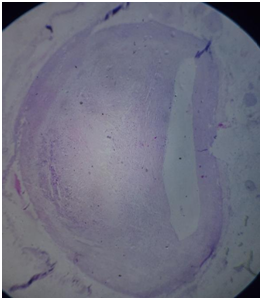 Histopathology report stated lungs showed few hyper inflated alveolar spaces with breakdown of alveolar septa, the spleen had oedematous and congested parenchyma. Liver showed extensive hepatocellular necrosis, fatty change & congestion. Section from coronary artery showed an intimal lesion composed of macrophages, lymphocytes, fibroblasts, smooth muscles and cholesterol clefts occluding the vascular lumen (80%), showing atheroma of coronary artery (Figures 6–8).