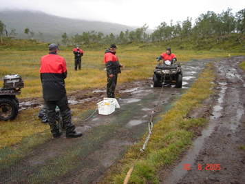 The project started with a Norwegian patent (Norvia AS) as a base where a net was just put out on the ground and anchored with big screw types made of plastics. Then ATVs (All Terrain Vehicles) were supposed to be able to travel on that reinforced ground (Figure 2).3