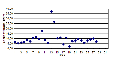 Figure 4 Test results from the tensile testing of varying types of geonets. Type nr 13 and 14 was a PP plane stiff geonet, that we used during further tests.