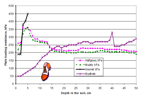 Figure 6 Measured plate strength with 10 cm2 round plate on undisturbed halfgrass meadow (n=3) and straight (X) on a halfgrass (sedge) meadow with geonet. Max. applied force was 450 kPa. The shoe indicates a human foot pressure sinkage on the muddy ground.