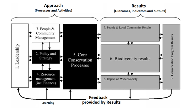 The Conservation Excellence Model (CEM) was developed by Black & Groombridge66 to encourage improved performance and effectiveness in conservation organisations. It offers an evaluation method based upon established organisation improvement practices67 aligned with organisation theory.68 CEM uses a system-thinking approach,69 which remains relevant for users in a variety of cultural, social and environmental contexts to understand how results and approaches correlate and whether the programme’s purpose can be achieved within its design, how people are involved and utilised, and the application of policy and activities.68 The advantage of the CEM evaluation framework (Figure 1) is that it includes five “Approach” criteria (Leadership, People & Community Management, Policy & Strategy, Resource Management) and four “Results” criteria (People & Local Community Results, Biodiversity Results, Impact on Wider Society, Conservation Program Results) and the links between each.66 This data is taken through observation of the programme and engagement of stakeholders involved in its activities. Assessments using this model address both the activities conducted by an organisation to achieve its aims and the actual outcomes resulting from these activities,66 making it an excellent example of the type of evidence-based approach which has been repeatedly called for in the literature.62,64,70