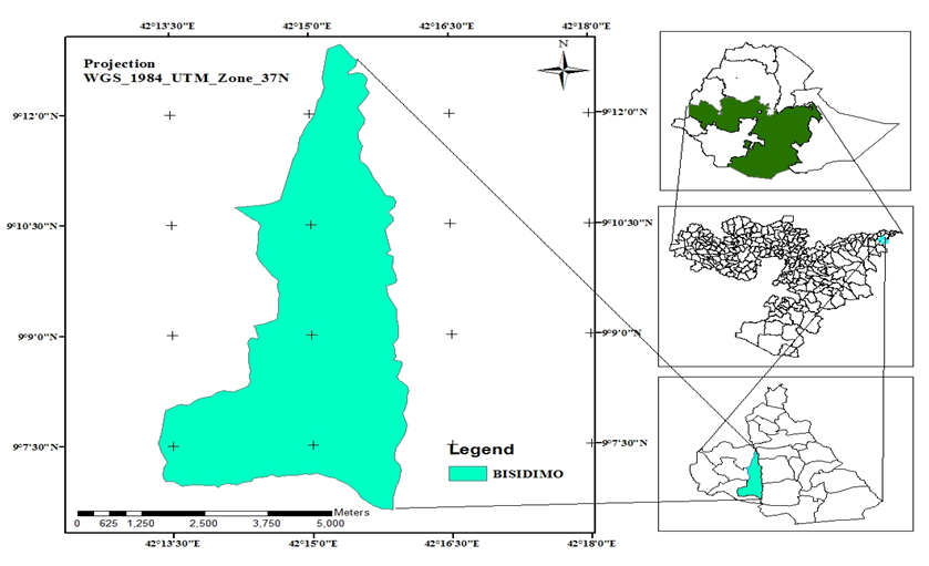 The study area, Baile District, is located at about 30 and 90km, respectively, from Harar and Jijiga towns in the Oromia Regional State, Eastern Ethiopia (Figure 1). The District lies between 080 21’ and 090 11’ N latitude and 420 15’-420 55’E longitude with an altitude range of 900-2000 meters above sea level (masl). According to the Ethiopian agro climatic zonation,15 the study area falls in the lowland region. The ten years (2002-2012) climatic data of Bisidimo area indicated an average annual rainfall of 650mm which is characterized by bimodal rainfall pattern. The annual mean maximum and minimum temperatures for the same period were 30.9 and 23.50C, respectively.