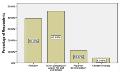 The major threats of the Lake ecosystem listed by the respondents were over-pumping of water for salt extraction, pollution, deforestation of Lakeshore vegetation and climate change (Figure 1). When requested whether the benefits accrued from salt extraction are better than the Lake’s ecological services, 70.7% of the respondents strongly agreed, but 16.3% disagreed.