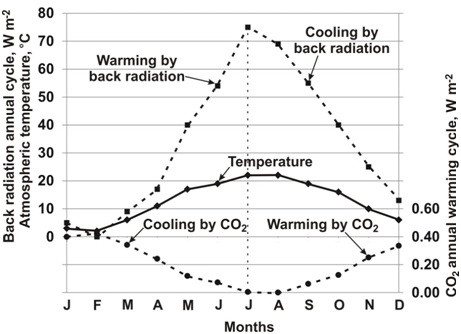 Figure 1 The warming effect of back radiation rises by 70Wm–2 from January to July while CO2 causes cooling of 0.45 Wm–2as its concentration falls.