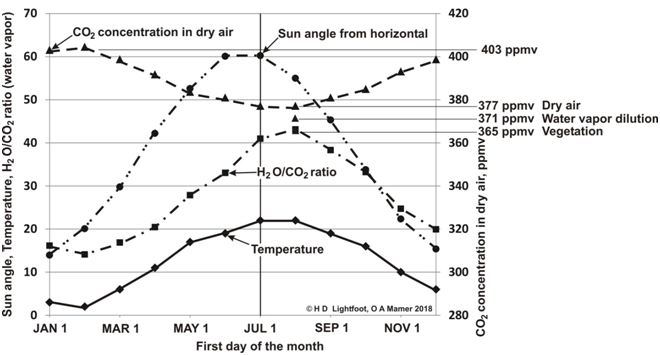 A table similar to that of Table 2 was used to construct Figure 2, which is a monthly plot of the sun angle, average atmospheric temperature at Hamburg, CO2 concentration in dry air and water vapor concentration (H2O/CO2 ratio) on the same graph. The H2O/CO2 ratio is the ratio of the number of water molecules to CO2 molecules.