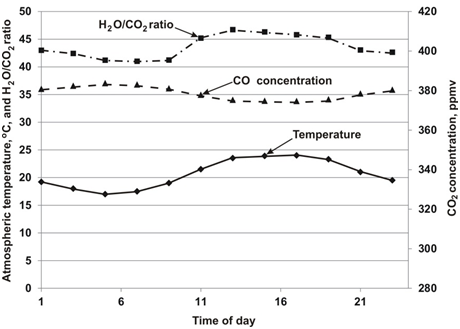 Typically, the annual inverse relationship between CO2 and water vapor occurs daily. For example, at Montreal, Canada, on the average July 1 the concentration of CO2 from 6 AM to mid–afternoon moves opposite to the temperature rise of 7°C and falls by 9.0 ppmv.