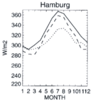 Figure 4 Back radiation from Wild et al.16 The measured values are the solid line. The dotted and dashed lines are computer simulations.