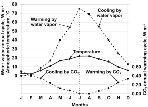 This is conclusive evidence that from winter to summer the warming by water vapor counteracts the small cooling by CO2. Conversely, from summer to winter, the warming effect of CO2 tends to warm the air as water vapor is cooling it. But the effects by CO2 each time are so small as to be negligible. This evidence comes to light because the gas laws show that in the atmosphere CO2 concentration falls as temperature rises. By examining the warming curves for water vapor2 and CO2 Lightfoot et al.,15 versus increased concentration separately from the atmosphere it appears logical to assume they are additive. Climate models consistently project increased atmospheric warming with increased CO2 concentration in the atmosphere. This could not happen if the models accounted for the fact that the large warming and cooling effects of water vapor counteract the small cooling and warming effects of CO2.