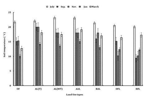 Soil characteristics varied under different land use types, except for RFL soil pH was mildly acidic in all other sites, soil bulk density was higher in AAL and DFL when compared to other land use types under study. Soil organic C (F0.05,6,14= 32.9) and Nitrogen (F0.05,6,14= 151) varied significantly between different sites, organic C was significantly higher (F0.05,6,14= 151) in AL (T) as compared to all other sites but did not vary significantly between RFL and OF, between AL (WT) and OF. Total nitrogen was significantly higher (F0.05,6,14= 151) in AL (WT) as compared to all other sites, but it did not vary significantly between AL (WT) and RFL and between AL (T) and OF. Soil organic carbon (q0.05,21,3 = 3.41) and nitrogen (q0.05, 21,3= 4.76) was significantly higher in AAL as compared to DFL (Table1).