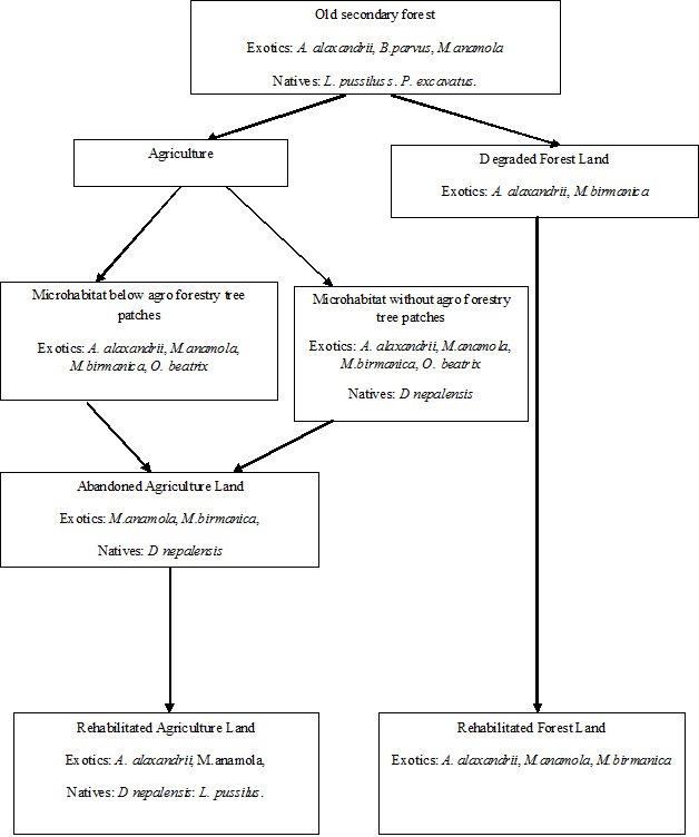 Consequences of deforestation arise from site degradation leading to modification of soil properties this significantly affect both incidence and abundance of soil macro fauna. Earthworm communities are more directly altered by these changes. Endemic and exotic species co-existed in the study area following deforestation and intensive cultivation. That native species were dominant in the undisturbed sites and disturbance and degradations leads to invasion by the exotic species holds true in our study. The sites under study represented the degraded areas as none of the species reported from the present experimental plots were endemic to the region, all the species are either peregrine exotic or peregrine endemic to the area as many of the endemic species of this region probably exterminated during the last Quaternary Glaciation. The numbers of species present at our sites ranged between 2 to 5. The presence of litter layer and lower perturbation pressure resulted in the numerical dominance of Lennogaster pussilus in the Oak forest (OF) and the higher biomass of A. alexandri may be because of the larger size of the earthworm. B parvus, L. pussilus and P. excavatus are litter-associated taxa which were more directly affected by OF clearance and the resulting decrease in available litter, thus explaining their disappearance in the changed ecosystems, however improved soil moisture and temperature as well as input of organic matter in rehabilitated agricultural land (RAL) could probably be favourable factor for decolonization anddominance of L. pussilus. A. alexandri had wider ecological amplitudeoccurring under all land use types as reported in our studies, conversion of two other land use types resulted in lower species diversity. Our results show that the abandoned agriculture land (AAL) remains closer to the AL(T) than to the forest because in these land use types the overall vegetation diversity remains low corresponding to a low diversification of the organic resources thus explaining the similarity between the earthworm communities in land use types. Seasonal rhythmic pattern was exhibited by all the species identified.
