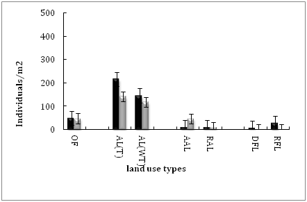 Earthworm species richness did not vary significantly between the OF, AL (T) and AL (WT), but in AAL and DFL number of species was lower; however rehabilitation of these ecosystems led to increase in species number in RAL and RFL (Table 3).