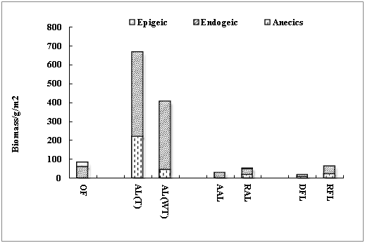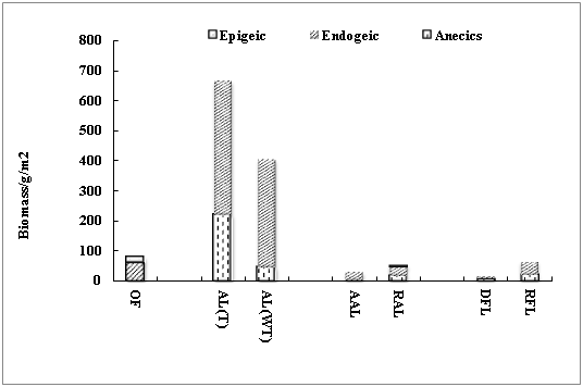 Within the same site, numerically epigeics formed the dominant (F0.05,2,6= 37.19) functional group under OF and in RAL (F0.05,2,6= 18.54), whereas endogeic were dominant under AL(T) (F0.05,2,6= 11.7), AL(WT) (F0.05,2,6= 28) and RFL(F0.05,2,6= 7.54), in AAL they were the only functional group present. Endogeics had significantly higher (F0.05,2,6= 19.4) biomass in OF and RAL when compared to epigeic and anecics. Anecics had lower abundance and biomass compared to other functional groups within the same sites.