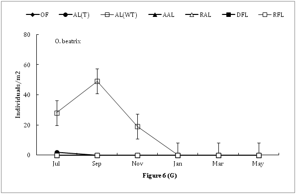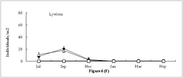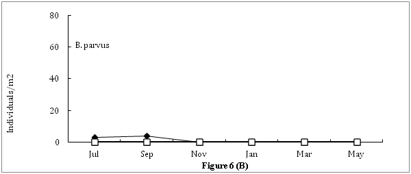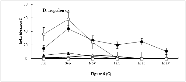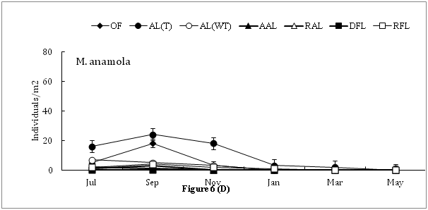Alexandri All the species showed significant seasonal variation. The density and biomass varied significantly seasonally in OF (F0.05,5,12= 124.6), AL(T) (F0.05,5,12= 133.8), AL(WT) (F0.05,5,12= 23.04) and RFL (F0.05,5,12= 8). It did not vary significantly in RAL and DFL. The species had significantly higher population density (q0.05,12,6= 7.54) and biomass (q0.05,12,6= 8) during Sep at all sites except in AL(WT)and where it had higher biomass (q0.05,12,6= 7.34) during July and in RFL where species showed a minor increase in population density during January. B. parvus was present only in the oak forest and did not show any significant variation seasonally in density as well as biomass values.