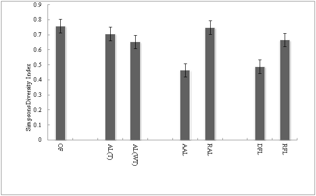 The Simpsons Diversity Index within the earthworm communities under different land use types was lowest in AAL and maximum in OF. The diversity index was similar between OF and RAL. Within the agro ecosystem the diversity Index was lower in AL (WT) compared to AL (T), but rehabilitation of degraded ecosystem led to improved diversity Index in RAL and RFL (Figure 7).