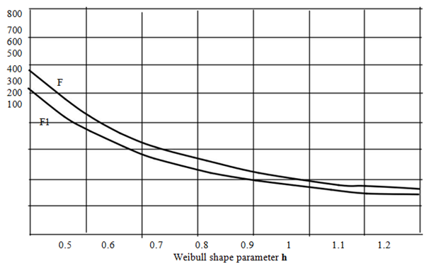 ; h are parameters of Weibull distribution; q is Weibull scale parameter, it is determined for the stress range,