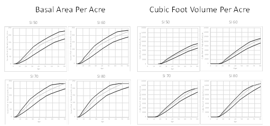 Figure 1 Basal area and total merchantable cubic foot volume (minimum DBH of 4 in to a 4 in top DIB) projections by planting density (300, 500, and 700 seedlings per acre) and site index (50, 60, 70, and 80 ft–base age 25). The black bold lines are projections for 700 seedlings per acre, gray lines are projections for 500 seedlings per acre, and black lines are projections for 300 seedlings per acre.