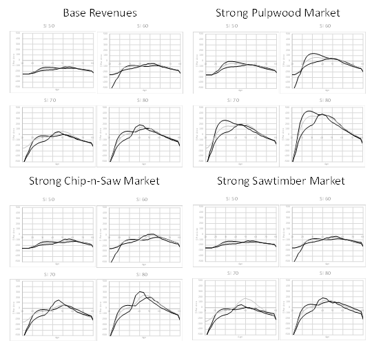 Regardless of site quality, if a very strong pulpwood market exists rotation ages will be drastically shortened to around 15 to 25 years. When chip–n–saw markets are relatively strong optimal rotation ages are similar to the current market stumpage values on both site qualities, but become positive on the site index 60 sites. FVS does not predict a substantial amount of saw timber material to occur in these plantations for stand ages up to around 60 years and hence rotation ages are not predicted to be greatly impacted in those areas where saw timber would have a strong competitive advantage.