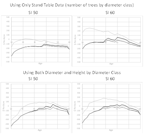 Figure 3 Dollars per acre (Soil Expectation Value) projections for a planting density of 750 seedlings per acre on site index 50 and 60 sites (base age 25) using published stand table data (diameters only –UPPER) AND stand table data (diameters) and associated heights (LOWER) from Smalley and Bailey14 of 10 year old plantations for calibration. Site index 50 on the left and site index 60 on the right. The gray line is when there are strong pulpwood markets ($20/ton), the black line is when there are strong chip–n–saw markets ($29/ton), the gray bold line is when there are strong sawlog markets ($40/ton), and the black bold line are the current stumpage revenues ($10/ton for pulpwood, $19/ton for chip–n–saw, and $25/ton for saw logs). The bold gray and bold black lines basically coincide with each other.