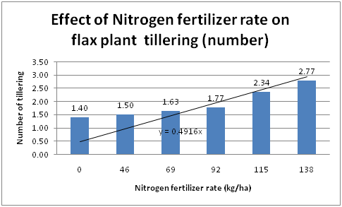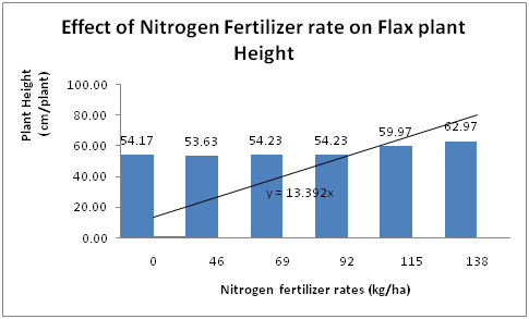 The Analysis of variances showed that plant height (cm)/plant, number of tillers/plant, number of branch/plant, branch height/plant (cm)/plant, fresh Weight (g)/plant, dry weight (g)/plant and number of pod per plant or capsule to nitrogen rate application. Generally flax plant height and branch height showed an increasing trend with nitrogen fertilizer rate (Figure 1). Similar trend was obtained for plant tillering, fresh and dry weight (Figure 2) (Figure 3). Increase of Nitrogen fertilizer rate increased the flax fiber length (Figure 4). About 58cm fiber length was obtained against 138kg N/ha fertgilizer ate (Figure 4) and the lowest was in the control treatment.