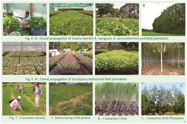 As part of contract farming, SARA is also actively engaged in producing quality superior clones of Eucalyptus, Acacia, Casuarina and Subabul. It has set up an advanced clonal nursery with an area of 3 000 sq. m. and with five mist chambers. This clonal nursery produces 50-60 lacks of clonal saplings which are transplanted to the farmers’ fields (Figure 1).