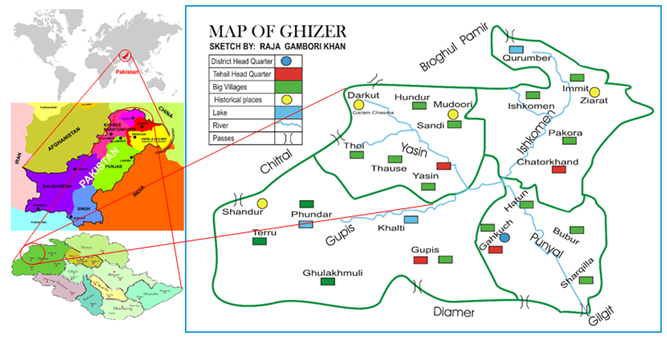 Study was carried out during 2016 in Yaseen Valley of district Ghizer (map and location in the figure 3). It is highly mountainous area and bordered with Afghanistan. Most of the year remains cool with chilling winter. People heavily rely on apple production. Valley is famous for healthy apple production. A total of seven verities were taken into considerations which are commonly grown in the area. These varieties are Iskarkh Balt, Faransaisi Bhalt, Khama Bhalt, Haray Bhalt, Shoot Bhalt, Dhan Bhalt and Basuti Bhalt. Data against leaves, fruit, seed and stem was taken from four different villages. Ten plants of each varieity were identified from each village and 10 leaves and fruits were collected for their measurement. Means were calculate d for leaf length (cm), leaf width (cm), leaf area (cm2), fresh fruit weight (g), number of seed chambers in each fruit, number of seeds in each fruit and total weight of total seeds in each fresh fruit (g).
