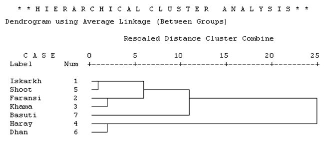 Based on the data Hierarchical Clustering Analysis (Figure 4) dendrogram revealed that all these varieties can be grouped into two major varieties i.e. Group A and B. Group A include varieties Iskarkh, Shoot, Faransisi, Khama and Basuti. Similarly, group B include Haray and Dhan showed closely relatedness. In group A, there are a three inferior taxon may be called as forma, these are A1 with Iskarakh and Shoot, A2 contains Faransisi and Khama whereas A3 having single varieity i.e. Basuti.
