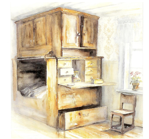 Figure 14 An old type of cabinet bed. A complex bed with a cabinet inbuilt and drawer, but usually the bed was covered with curtains. This was the master bed for the old man who wished to have control (old place in Lycksele, Kerstin Westin, painting).