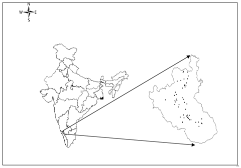 From the initial reconnaissance survey it was found that some of the very small sacred groves were very difficult to locate and some of them do not exist. Therefore, groves of size one to five acres wasnot included in the study. The groves were located from the village maps (scale 1:7920) developed by Surveyor General of India, maintained by Office of Assistant Director of Land Records. The selected groves were grouped into five size classes and from each size class 25 per cent of the groves were sampled (Table 1). The details of the location of the study site and the distribution of sampling plots are depicted in Figure 1. Stratified random sampling was adopted for collection of data from the groves. Stratified random sampling is a technique which attempts to restrict the possible samples to those which are “less extreme” by ensuring that all parts of the population are represented in the sample in order to increase the efficiency. In stratified sampling the population of a unit is first divided into disjoint groups. These subgroups, called strata, together they compromise the whole population, so that each stratum a sample, of pre–specified size, is drawn independently in different strata. Then the collections of these samples constitute a stratified sample. Carbon stock estimation ofthe sacred groves was collated from three major pools of carbon namely; the above ground biomass (AGB) of standing trees, litter and the soil. For estimating the carbon in the standing trees non–destructive method of biomass estimation was followed. In each of the identified groves two plots of size 20m x 20m were laid, one in the middle of the grove and the other towards the outer periphery of the grove. Height and diameter at breast height (DBH) of all the tree species with more than 30 cm girth were measured and identified to species level following the taxonomic classifications.29,30 DBH was measured at 1.37m from the ground using the non–stretchablemeasuring tapeand the height was measured using digital clinometer (Haglof, Sweden). In the absence of allometric equations for all the 145 tree species, we used DBH and tree height to estimate the trunk volume31 and volume was multiplied with the wood density of respective tree species32,33 to derive the biomass. To estimate the biomass in the crown, expansion ratio was used34 and 50 percent of the biomass thus derived was considered as carbon content.35