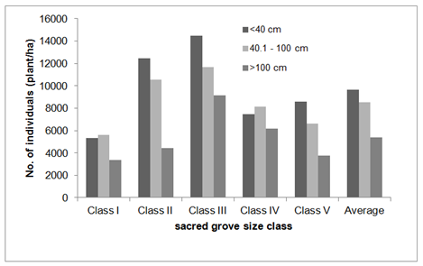 When the conditions are favorable for growth it should also be reflected in the tree population. Tree density in the groves varied from 299 to 431 tree/ha across the size class of the groves, with an average 360 tree ha–1 (Figure 2). Tree density recorded in deciduous forest type of the district is as low as 67 tree ha–1 and highest recorded is 270 treeha–1 in semi evergreen forest type.18 In a managed ecosystem of the district viz; coffee plantation (coffee is grown under the partial shade of trees in India) shade tree density is reported to vary from 370 tree ha–1 in evergreen vegetation type to 361 trees ha–1 in moist deciduous vegetation type of the district41. Thus it is evident that the tree density of sacred groves is on par with a managed ecosystem and much higher than a natural forest ecosystem, reiterating the fact that the growing conditions prevalent in the sacred groves are congenial for growth. This was also evident from the natural regeneration of the sacred groves (Figure 4). The average number of regeneration in three size classes of regeneration was 9663, 8515 and 5369 plants/hectare in the <40, 40.1 to 100 and >100 cm height classes respectively. The number of individuals decreasing progressively with size of the recruits is a sign of healthy growing environment10 and is also indicative of the fact that conditions in the sacred groves are favorable for natural regeneration. Tree density can also be attributed to tree planting of certain species by the local communities.