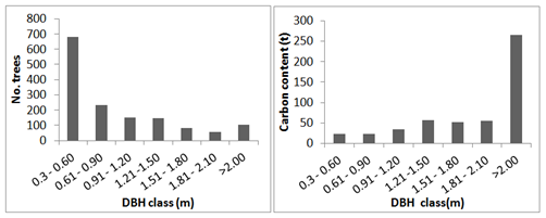 Figure 5 Size class distribution of tree population in the sacred groves and the amount of carbon stored in the respective girth classes.